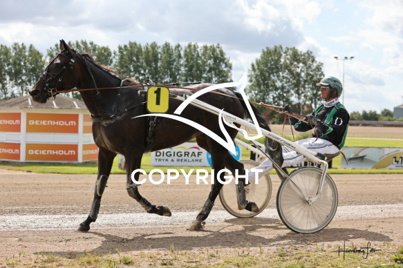 - Beskrivelse: JUST TIME med Jan Dahlgaard vinder dagens 1 løb. DM for Professionelle Travtrænere 2025 (7. afd.) - Amerikanerløb Spar Nord Arena-Aalborg Væddeløbsbane d. 9/8-2025. Fotograf: Hesselborg Foto