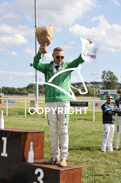 - Beskrivelse: DM for Professionelle Travtrænere - Præmieoverrækkelse blev vundet af Michael Lønborg. Spar Nord Arena-Aalborg Væddeløbsbane d. 9/8-2025. Fotograf: Hesselborg Foto