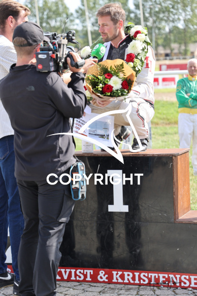 - Beskrivelse: DM for Professionelle Travtrænere - Præmieoverrækkelse blev vundet af Michael Lønborg. Spar Nord Arena-Aalborg Væddeløbsbane d. 9/8-2025. Fotograf: Hesselborg Foto