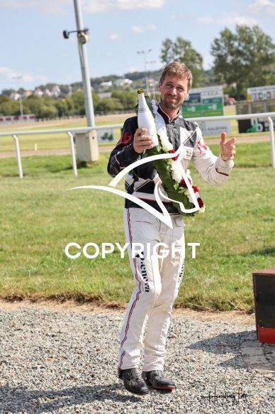 - Beskrivelse: DM for Professionelle Travtrænere - Præmieoverrækkelse blev vundet af Michael Lønborg. Spar Nord Arena-Aalborg Væddeløbsbane d. 9/8-2025. Fotograf: Hesselborg Foto