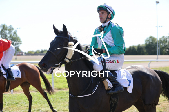- Beskrivelse: Fallen Angel med Lorenzo Putzulu vinder dagens 4 galopløb. ELKÆR STUTTERI FULDBLODSFONDS ÆRESPRÆMIE Spar Nord Arena-Aalborg Væddeløbsbane d. 23/8-2025. Fotograf: Hesselborg Foto