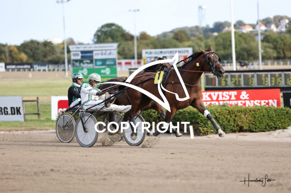 - Beskrivelse: R K STAR med Jeppe Juel vinder dagens 1 løb. Spar Nord Arena-Aalborg Væddeløbsbane d. 27/8-2025. Fotograf: Hesselborg Foto
