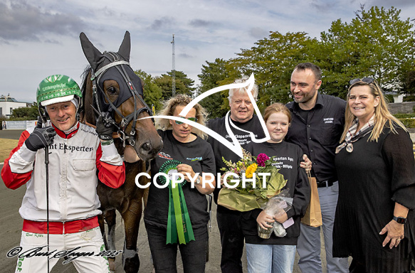 - Billede Beskrivelse: LUCIFER med Rene Kjær 1. løbs vinder, på Charlottenlund d. 2025-08-29. Photo: Burt Seeger.