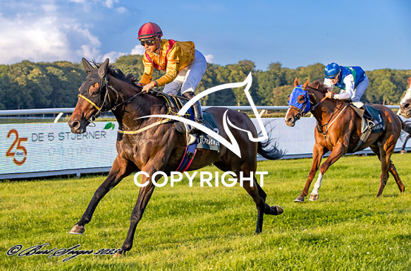 - Billede Beskrivelse: NEWTON med Elin Hedeman 3. løbs vinder på Klampenborg d. 2024-08-30. Photo: Burt Seeger.