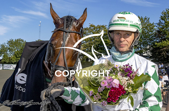 - Billede Beskrivelse: LOOKERBIE DIAMOND med Flemming Jensen 10. løbs vinder, på Charlottenlund d. 2025-08-31. Photo: Burt Seeger.