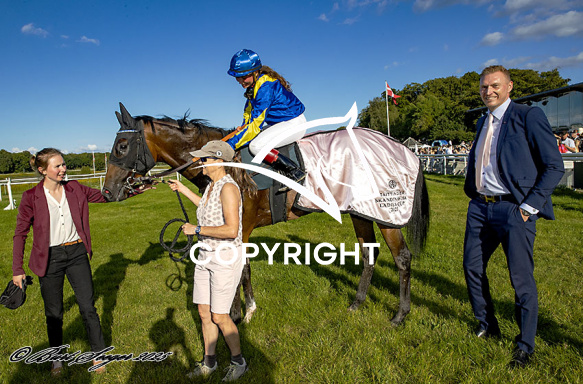 - Billede Beskrivelse: PERSIAN MAGIC med Laura Vestergaard 6. løbs vinder af Champagneløbet 2025, på Klampenborg d. 2024-09-06. Photo: Burt Seeger.