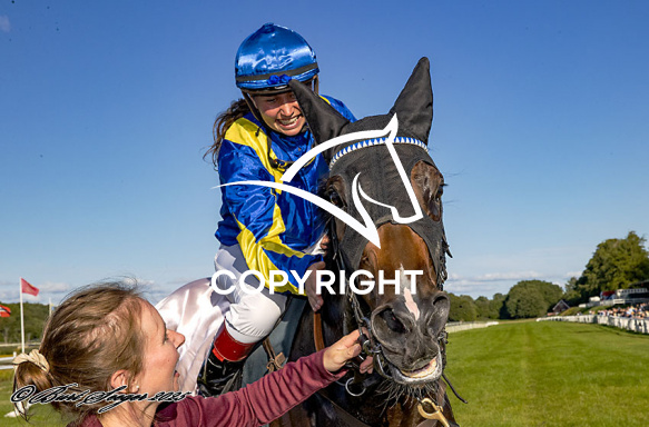- Beskrivelse: PERSIAN MAGIC med Laura Vestergaard 6. løbs vinder af Champagneløbet 2025, på Klampenborg d. 2024-09-06. Photo: Burt Seeger.