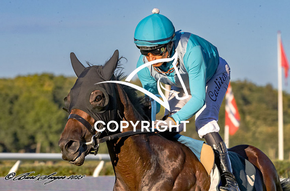 - Beskrivelse: LAW'S DELAY med Carlos Lopez 8. løbs vinder på Klampenborg d. 2024-09-06. Photo: Burt Seeger.