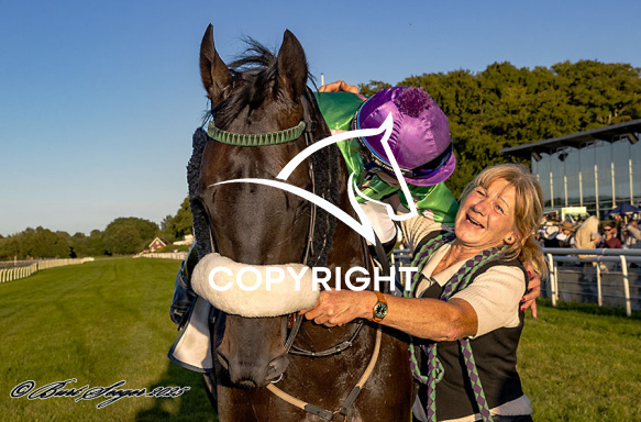 - Beskrivelse: SIR MACKEN MED EVELINA R¨ONNLUND 9. løbs vinder på Klampenborg d. 2024-09-06. Photo: Burt Seeger.