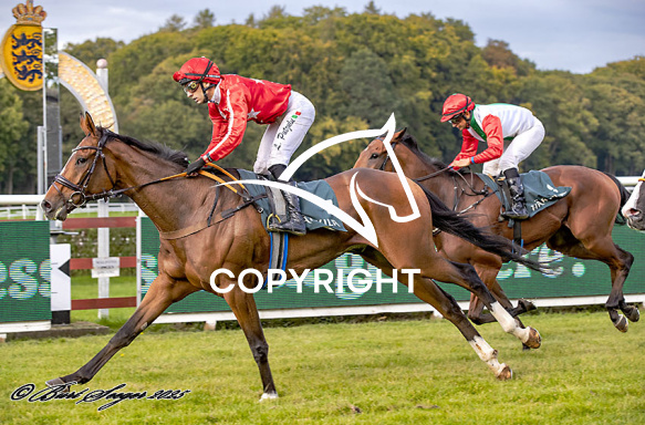 - Billede Beskrivelse: ESQUIRE HILL med Lorenzo Putzulu 9. løbs vinder på Klampenborg d. 2025-09-20. Photo: Burt Seeger.