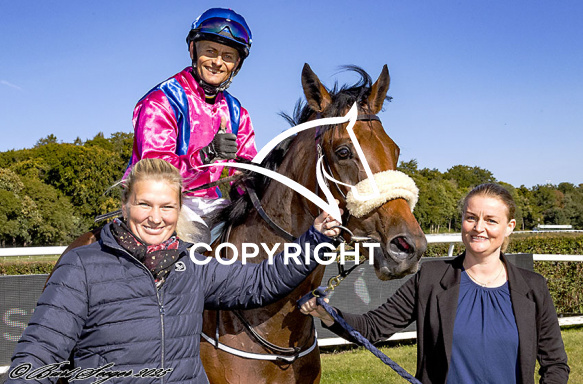 - Billede Beskrivelse: LADY MEDINA med Per-Anders Gråberg 1. løbs vinder på Klampenborg d. 2025-09-27. Photo: Burt Seeger.