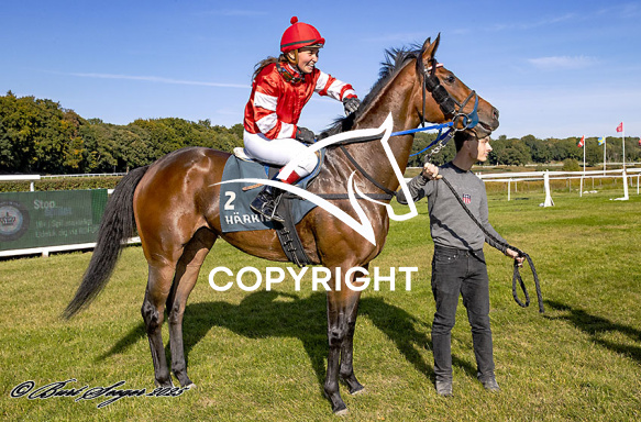 - Billede Beskrivelse: WOULD SHE med Laura Vestergaard 6. løbs vinder på Klampenborg d. 2025-09-27. Photo: Burt Seeger.