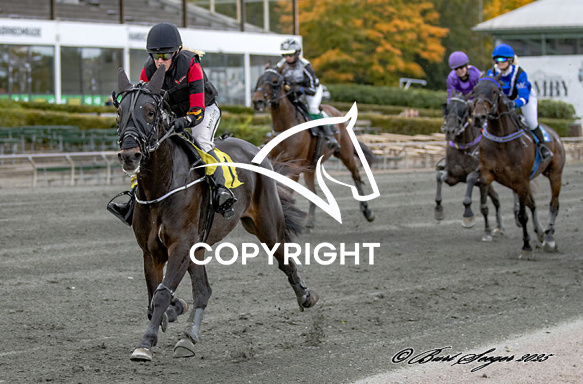 - Beskrivelse: BEN LANDIA med Anna Gren 1. løbs vinder,, på Charlottenlund d. 2025-10-05. Photo: Burt Seeger.