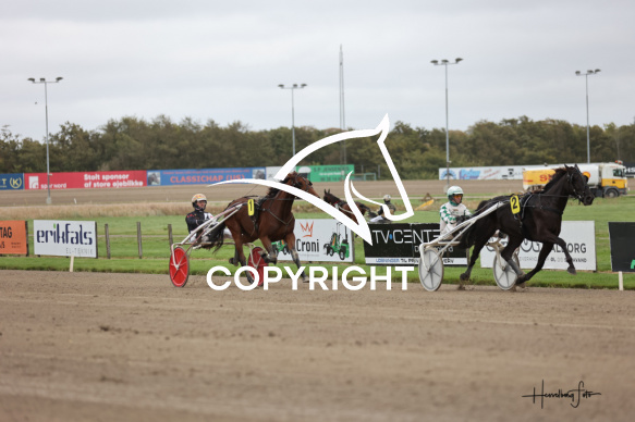 - Beskrivelse: CECILIA BANKER med Flemming Jensen vinder dagens 1 løb. 2 års Løb Spar Nord Arena-Aalborg Væddeløbsbane d. 10/10-2025. Fotograf: Hesselborg Foto