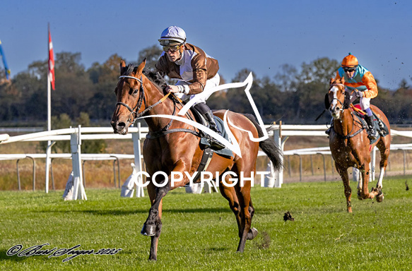 - Billede Beskrivelse: DARLINGTON med Oliver Wilson 1. løbs vinder på Klampenborg d. 2025-10-18. Photo: Burt Seeger.