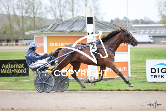 - Beskrivelse: HUGO SPIN med Allan Kristensen vinder dagens 7 løb. Amatørløb - Amerikanerløb Spar Nord Arena-Aalborg Væddeløbsbane d. 1/11-2025. Fotograf: Hesselborg Foto