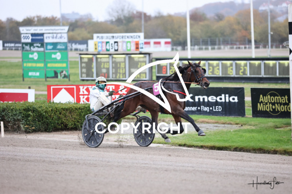 - Beskrivelse: JACKS CROSS med Jeppe Juel vinder dagens 8 løb. Spar Nord Arena-Aalborg Væddeløbsbane d. 1/11-2025. Fotograf: Hesselborg Foto