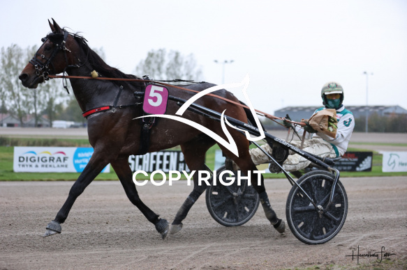 - Beskrivelse: JACKS CROSS med Jeppe Juel vinder dagens 8 løb. Spar Nord Arena-Aalborg Væddeløbsbane d. 1/11-2025. Fotograf: Hesselborg Foto
