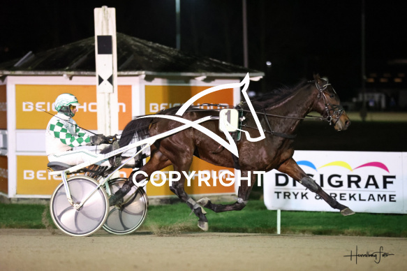 - Beskrivelse: SHOWMAN med Flemming Jensen vinder dagens 1 løb. Spar Nord Arena-Aalborg Væddeløbsbane d.24/11-2025. Fotograf: Hesselborg Foto