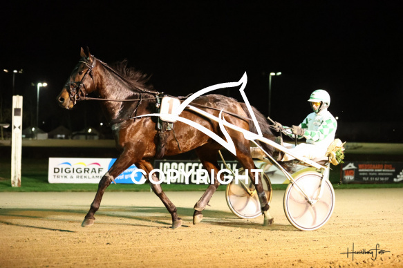 - Beskrivelse: SHOWMAN med Flemming Jensen vinder dagens 1 løb. Spar Nord Arena-Aalborg Væddeløbsbane d.24/11-2025. Fotograf: Hesselborg Foto