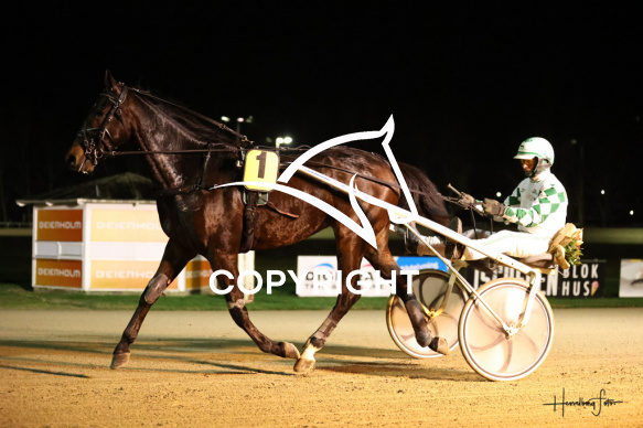 - Beskrivelse: SHOWMAN med Flemming Jensen vinder dagens 1 løb. Spar Nord Arena-Aalborg Væddeløbsbane d.24/11-2025. Fotograf: Hesselborg Foto