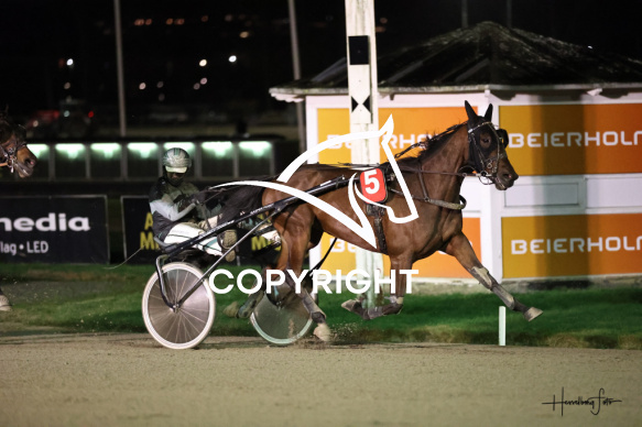 - Beskrivelse: STARCATCHER med Kasper Foget vinder dagens 3 løb. Stayerløb Spar Nord Arena-Aalborg Væddeløbsbane d. 24/11-2025. Fotograf: Hesselborg Foto