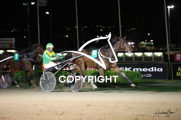 - Beskrivelse: INSPIRED LIGHTS med Henrik Lønborg vinder dagens 4 løb. Amerikanerløb m. justering af startspor. Spar Nord Arena-Aalborg Væddeløbsbane d. 24/11-2025. Fotograf: Hesselborg Foto