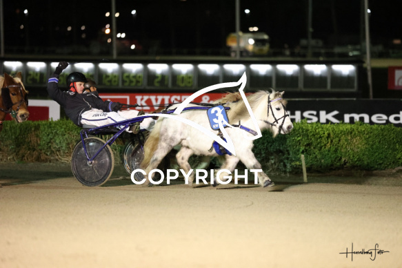 - Beskrivelse: Damkærs Tarzan med Marcus Kjølby Pedersen vinder dagens ponyløb her på Spar Nord Arena-Aalborg Væddeløbsbane d. 24/11-2025. Sponsor: Travtræner Kasper K. Andersen Aalborg Ponytravklub - Ikaros Fotograf: Hesselborg Foto