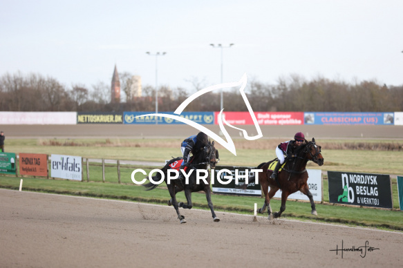 - Beskrivelse: HYRDEHØJ HURRICANE med Pernille Munch Lassen vinder dagens 8 løb. SU-Monteløb - Formløb Spar Nord Arena-Aalborg Væddeløbsbane d. 29/11-2025. Fotograf: Hesselborg Foto