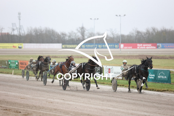- Beskrivelse: Dødtløb mellem POINT OF PERFECT med Flemming Jensen og EDDIE THE EAGLE med Christina Lønborg vinder dagens 6 løb. Hurtigklassen Spar Nord Arena-Aalborg Væddeløbsbane d. 7/12-2025. Fotograf: Hesselborg Foto