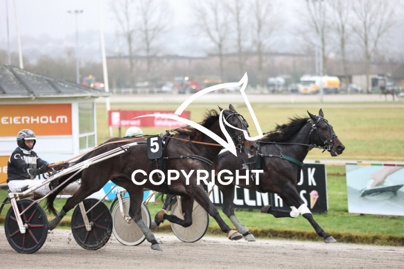 - Beskrivelse: Dødtløb mellem POINT OF PERFECT med Flemming Jensen og EDDIE THE EAGLE med Christina Lønborg vinder dagens 6 løb. Hurtigklassen Spar Nord Arena-Aalborg Væddeløbsbane d. 7/12-2025. Fotograf: Hesselborg Foto