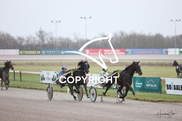 - Beskrivelse: AALBORG HESTEJERFORENINGS LØB blev vundet af SHOWMAN med Flemming Jensen. Amerikanerløb Spar Nord Arena-Aalborg Væddeløbsbane d.14/12-2025. Fotograf: Hesselborg Foto