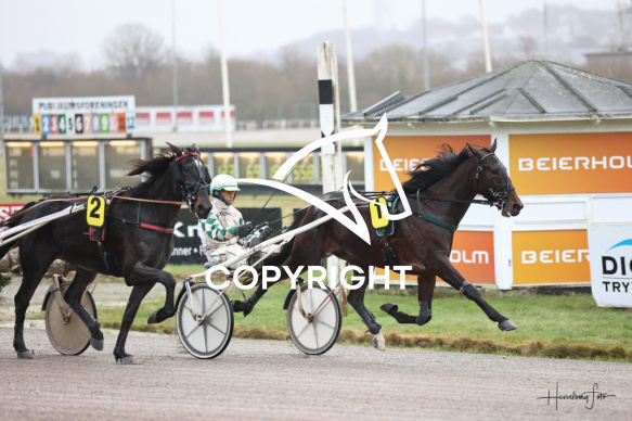 - Beskrivelse: AALBORG HESTEJERFORENINGS LØB blev vundet af SHOWMAN med Flemming Jensen. Amerikanerløb Spar Nord Arena-Aalborg Væddeløbsbane d.14/12-2025. Fotograf: Hesselborg Foto