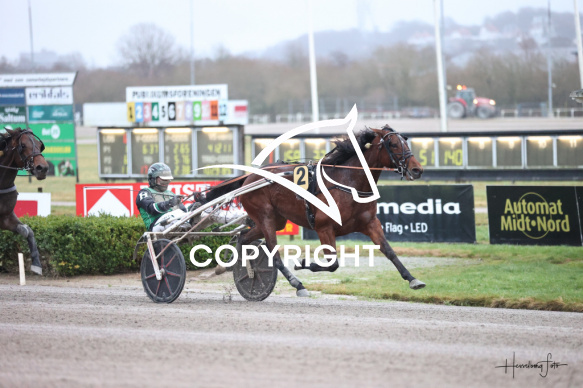 - Beskrivelse: KM Horses v Karina Madsen Løb vindes af KLEOPATRA S F med Mads Hviid og er dagens 7 løb som er et Amerikanerløb. Sponsor: KM Horses v Karina Madsen Løb. Spar Nord Arena-Aalborg Væddeløbsbane d. 14/12-2025. Fotograf: Hesselborg Foto