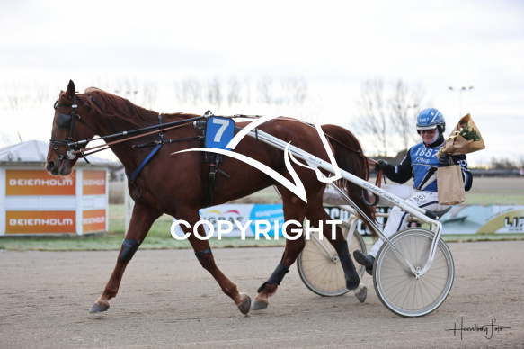 - Beskrivelse: Løb 2 blev vundet af KANON ÅSTRUP med Mads Henriksen og er dagens 2 løb. Amerikanerløb Spar Nord Arena-Aalborg Væddeløbsbane d. 24/12-2025. Fotograf: Hesselborg Foto
