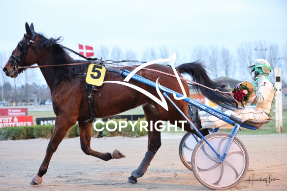 - Beskrivelse: Vinderen af 1 løb blev LORENZO TOFT med Jeppe Juel. Amerikanerløb m. justering af startspor Spar Nord Arena-Aalborg Væddeløbsbane d.23/1-2026. Fotograf: Hesselborg Foto