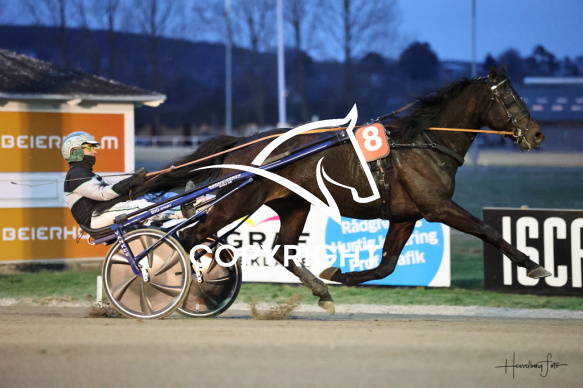 - Beskrivelse: HOUDINI SHADOW med Kasper Foget vandt dagens 3 løb. Amerikanerløb m. justering af startspor Spar Nord Arena-Aalborg Væddeløbsbane d.23/1-2026. Fotograf: Hesselborg Foto