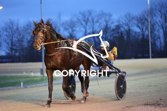 - Beskrivelse: HOUDINI SHADOW med Kasper Foget vandt dagens 3 løb. Amerikanerløb m. justering af startspor Spar Nord Arena-Aalborg Væddeløbsbane d.23/1-2026. Fotograf: Hesselborg Foto
