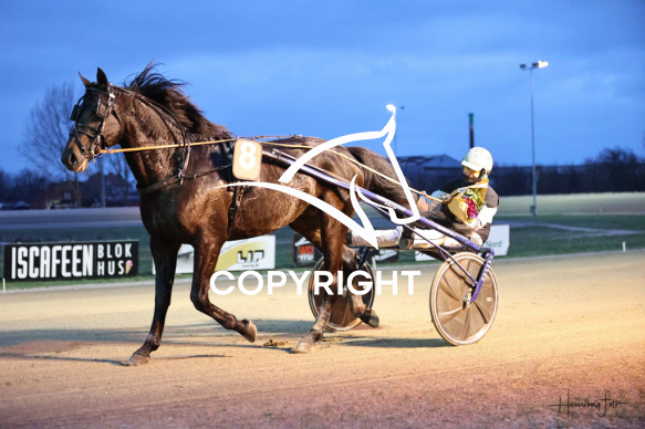 - Beskrivelse: HOUDINI SHADOW med Kasper Foget vandt dagens 3 løb. Amerikanerløb m. justering af startspor Spar Nord Arena-Aalborg Væddeløbsbane d.23/1-2026. Fotograf: Hesselborg Foto
