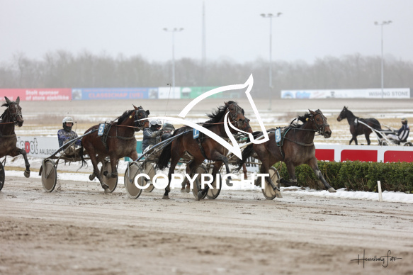 - Beskrivelse: Løb 2 blev vundet af LUMIERE S med Gordon Dahl og GAAGAA PEARL med Flemming Jensen. Amerikanerløb m. justering af startspor Spar Nord Arena-Aalborg Væddeløbsbane d.21/2-2026. Fotograf: Hesselborg Foto