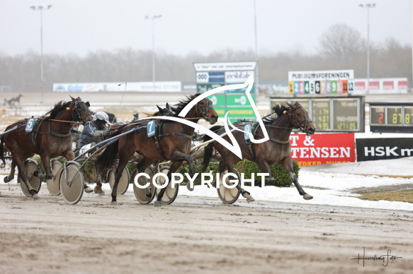 - Beskrivelse: Løb 2 blev vundet af LUMIERE S med Gordon Dahl og GAAGAA PEARL med Flemming Jensen. Amerikanerløb m. justering af startspor Spar Nord Arena-Aalborg Væddeløbsbane d.21/2-2026. Fotograf: Hesselborg Foto