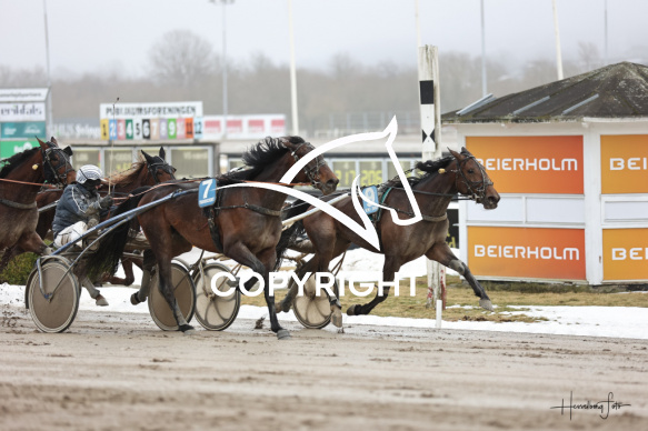 - Beskrivelse: Løb 2 blev vundet af LUMIERE S med Gordon Dahl og GAAGAA PEARL med Flemming Jensen. Amerikanerløb m. justering af startspor Spar Nord Arena-Aalborg Væddeløbsbane d.21/2-2026. Fotograf: Hesselborg Foto