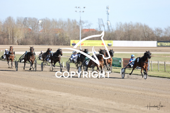 - Beskrivelse: FERRARI GARDENIA med Mathias Jensen vinder dagens 5 løb. Amerikanerløb m. justering af startspor - Max 500 point Spar Nord Arena-Aalborg Væddeløbsbane d.21/3-2026. Fotograf: Hesselborg Foto