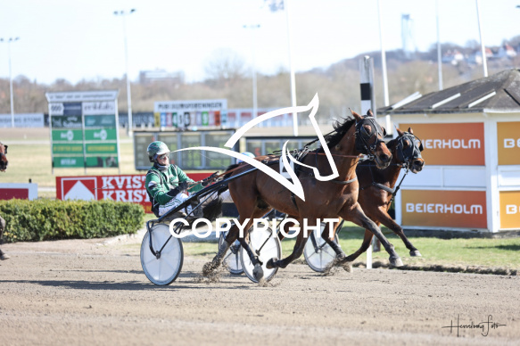 - Beskrivelse: FERRARI GARDENIA med Mathias Jensen vinder dagens 5 løb. Amerikanerløb m. justering af startspor - Max 500 point Spar Nord Arena-Aalborg Væddeløbsbane d.21/3-2026. Fotograf: Hesselborg Foto