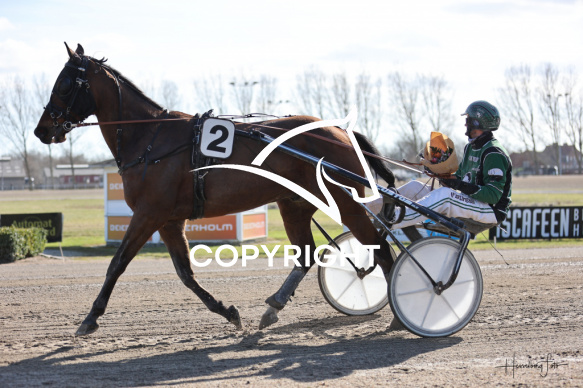 - Beskrivelse: FERRARI GARDENIA med Mathias Jensen vinder dagens 5 løb. Amerikanerløb m. justering af startspor - Max 500 point Spar Nord Arena-Aalborg Væddeløbsbane d.21/3-2026. Fotograf: Hesselborg Foto