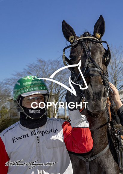 - Billede Beskrivelse: KOOGOO GAAGAA med Rene Kjær 6. løbs vinder,, på Charlottenlund d. 2026-04-05. Photo: Burt Seeger.