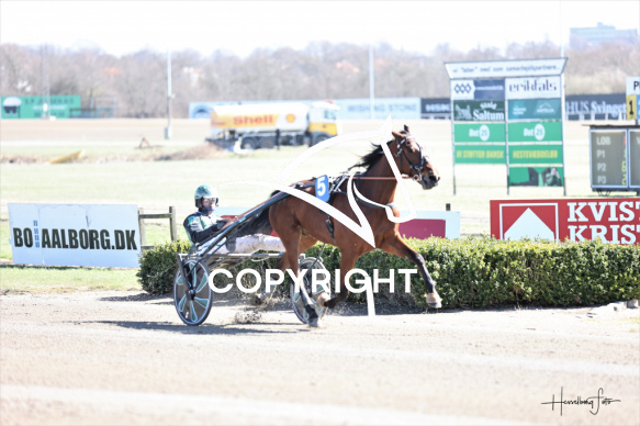 - Beskrivelse: Løb 2 blev vundet af FRITJOF S H med Nicklas Korfitsen. Tidsløb 1.15.5. Spar Nord Arena-Aalborg Væddeløbsbane d.6/4-2026. Fotograf: Hesselborg Foto