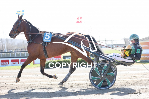 - Beskrivelse: Løb 2 blev vundet af FRITJOF S H med Nicklas Korfitsen. Tidsløb 1.15.5. Spar Nord Arena-Aalborg Væddeløbsbane d.6/4-2026. Fotograf: Hesselborg Foto
