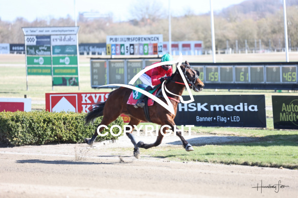 - Beskrivelse: JERRY med Camilla Boeck Munk vinder dagens 7 løb. Monteløb - Amerikanerløb. Spar Nord Arena-Aalborg Væddeløbsbane d.6/4-2026. Fotograf: Hesselborg Foto