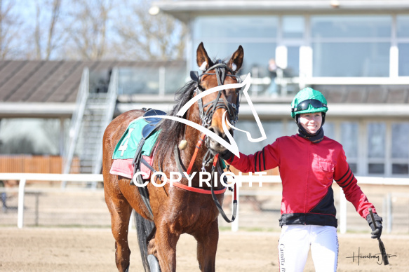 - Beskrivelse: JERRY med Camilla Boeck Munk vinder dagens 7 løb. Monteløb - Amerikanerløb. Spar Nord Arena-Aalborg Væddeløbsbane d.6/4-2026. Fotograf: Hesselborg Foto